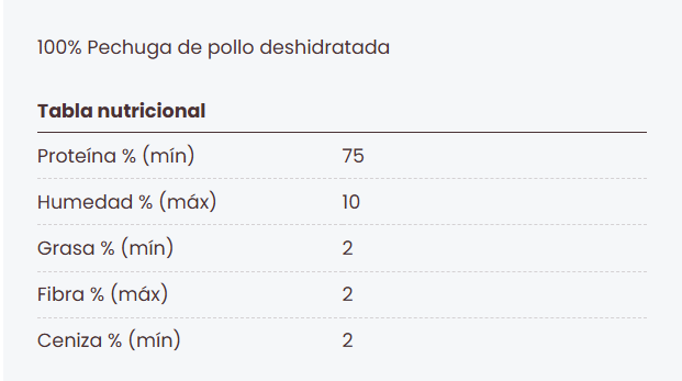 - 100% Pechuga de pollo deshidratada.
