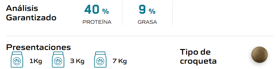 Ingredientes: Harina de pollo, Maíz, Gluten de maíz, Arroz, Torta de soya, Aceite de pollo, Harina de Salmón, Hidrolizado cárnico, Levadura de cerveza deshidratada, Lignocelulosa, Linaza, Bisulfato de sodio, Aceite desodorizado de pescado, Sal, Taurina, Vitaminas (Vitamina A, Vitamina D3, Vitamina E, Niacina, Vitamina C, Vitamina B1, Ácido pantoténico, Vitamina B2, Vitamina B6, Ácido fólico, Vitamina K3, Biotina, Vitamina B12), Minerales (Hierro, Manganeso, Yodo, Cobalto, Selenio, Selenio orgánico), Zeolita, Cloruro de colina, Cloruro de potasio, Hexametafosfato de sodio, Prebióticos (Betaglucanos y mananoligosacáridos-MOS), DL-metionina, Antifúngico, Minerales orgánicos (Zinc aminoácido quelado y Cobre aminoácido quelado), Antioxidantes (BHA, BHT), Extracto de Yucca schidigera y Sulfato de glucosamina.