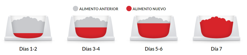 - ¿Nuevo en este alimento? Mezcle cantidades cada vez mayores del alimento nuevo de su mascota con cantidades cada vez menores del alimento anterior durante un periodo de 7 días.