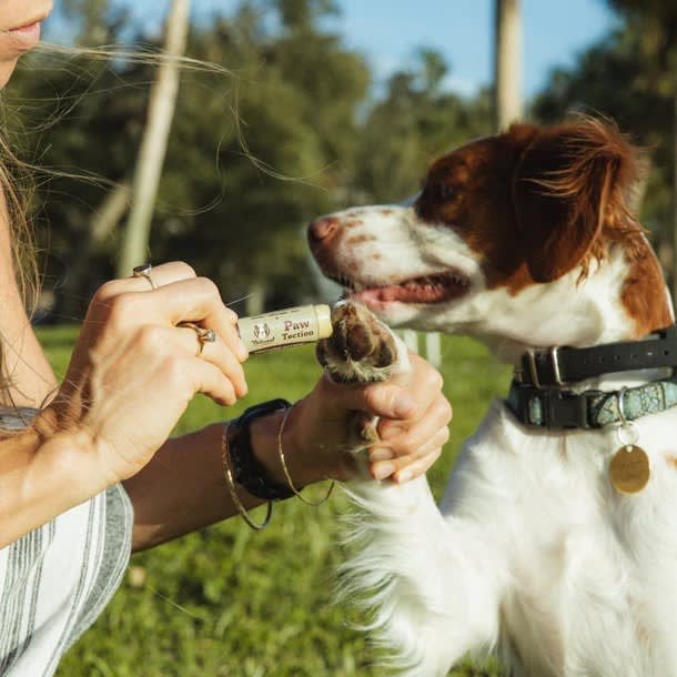 - Usar dos dedos o un paño poco absorbente para aplicar una cantidad generosa de PawTection directamente sobre las almohadillas de las patas de tu peludo