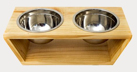Comedero de madera pino barnizado, e incluye bowls de acero inoxidable.