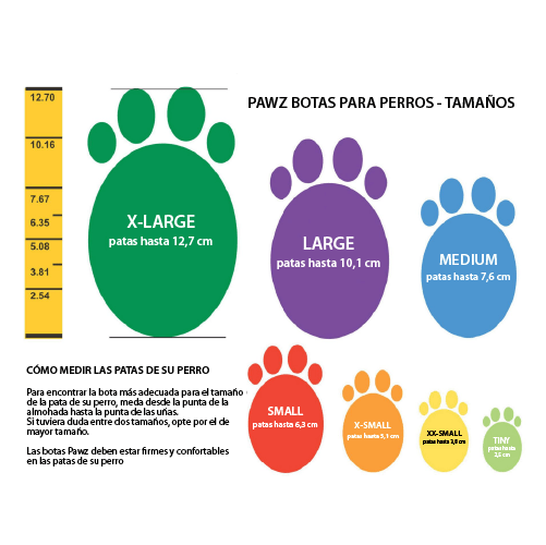 Para un mejor ajuste, mida desde la parte inferior de la almohadilla del talón grande hasta la punta de la uña más larga del pie. Si la pata está entre dos tamaños, seleccione el tamaño más grande. Las botas para perros Paw deben ajustarse de forma segura alrededor de la pierna y cómodas alrededor de la pata.