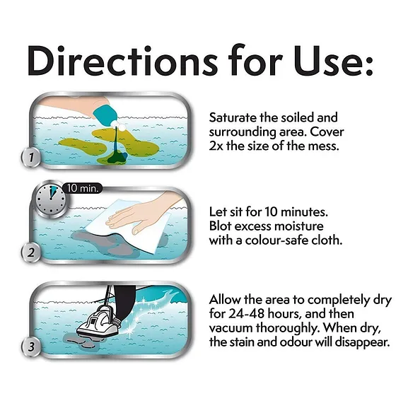 Elimine el exceso de desechos sólidos o líquidos. Agite bien y pruebe la solidez del color en un área oculta. Sature el área problemática. Si trata una alfombra, asegúrese de usar suficiente producto para alcanzar el respaldo y el acolchado de la alfombra. Deje que el producto penetre en la superficie durante diez minutos o más. Seque el exceso de humedad con un paño blanco limpio o una toalla de papel. Deje que el área se seque de forma natural, lo que puede tardar entre 24 y 48 horas. Cuando esté seco, el olor desaparecerá.