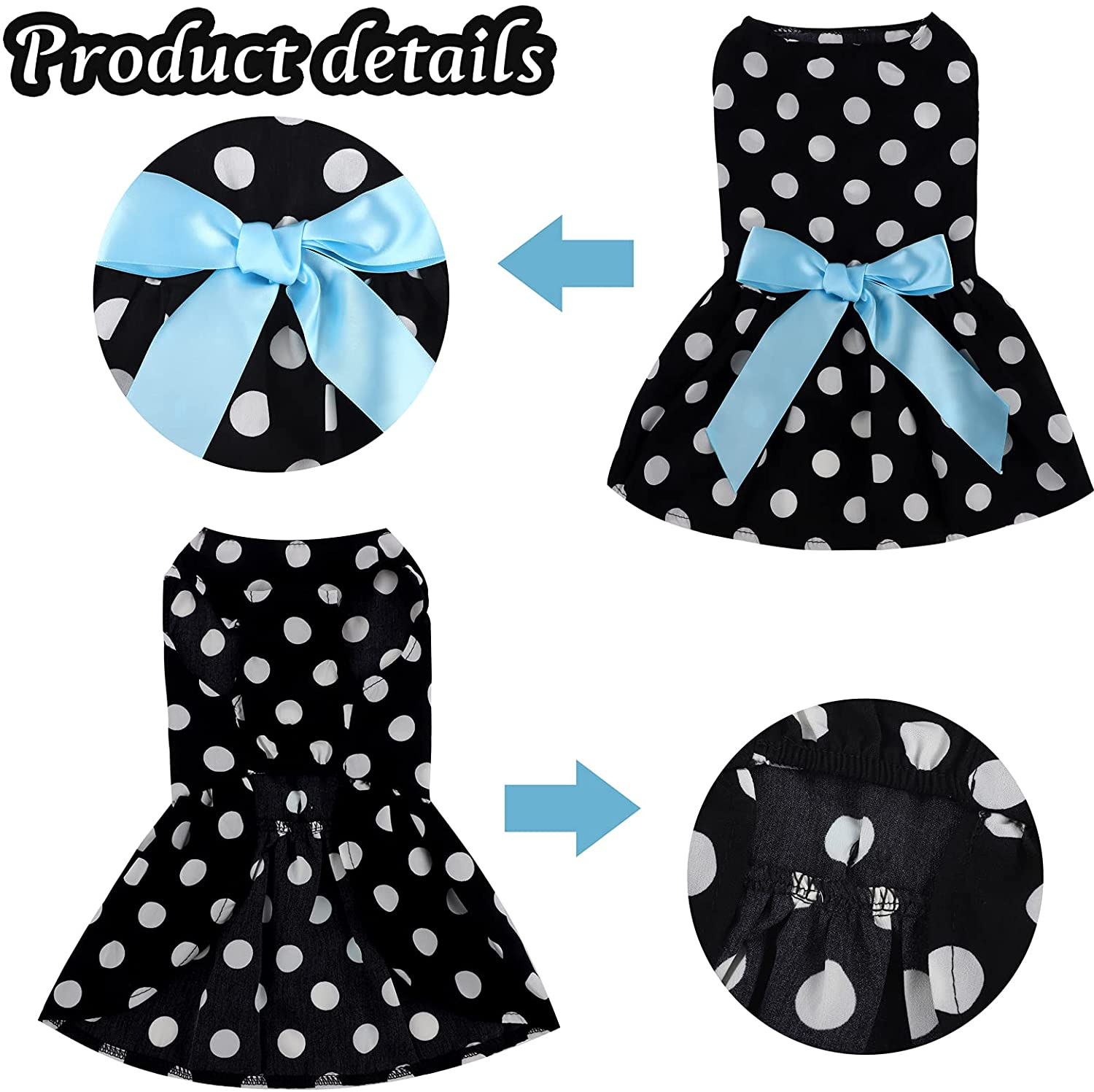 Hermoso vestido, elaborado en poliéster suave, ligero y cómodo, adecuado para tu mascota. Con estampado de lunares blancos clásicos, y un lazo que hará lucir hermosa a tu mascota.