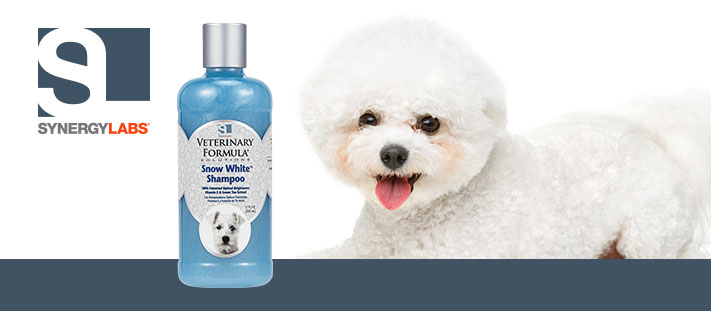 Shampoo para la limpieza de mascotas con pelaje blanco.